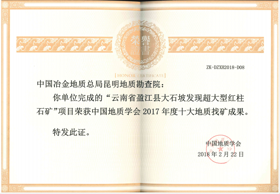 2018年2月22日,昆明地質(zhì)勘查院完成的“云南省盈江縣大石坡超大型紅柱石礦”項(xiàng)目獲得中國(guó)地質(zhì)學(xué)會(huì)2017年度“十大地質(zhì)科技進(jìn)展、十大地質(zhì)找礦成果”獎(jiǎng)。